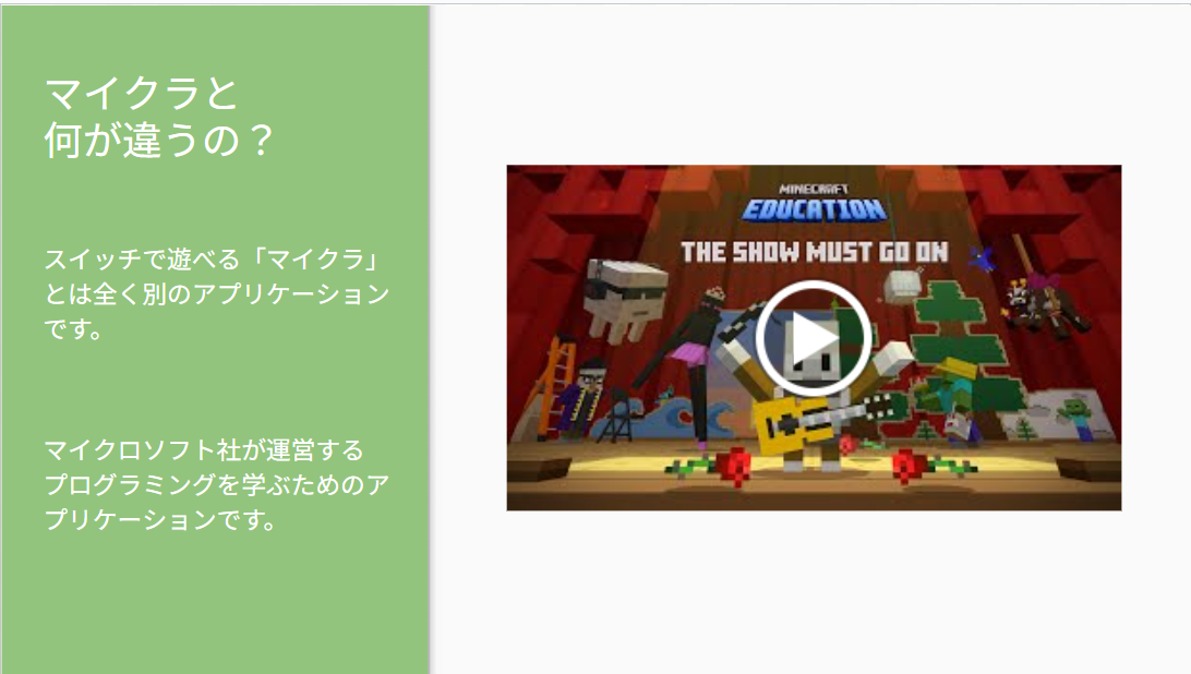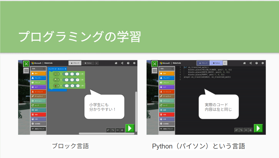 教育版「マインクラフト」である「マインクラフトエデュケーション」を使い、プログラミングおよび「情報」科目の基礎知識を学ぶことができます。
